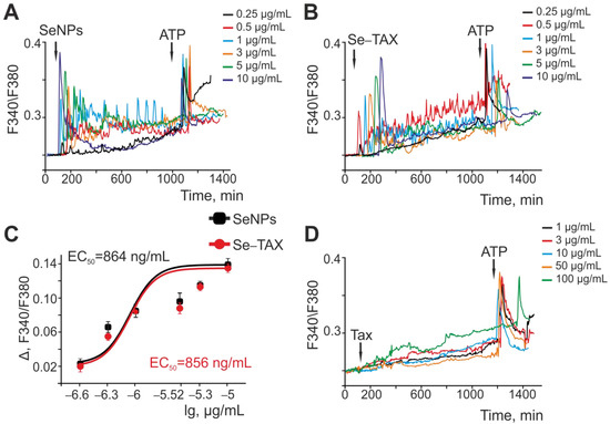 It has been shown previously that selenium nanoparticles activate the Ca2+-signaling system of astrocytes from the cerebral cortex, and the effects of SeNPs on neurons are mediated by neuron–glial interactions [18]. “Naked” SeNPs (Figure 4A) and the Se–TAX nanocomplex (Figure 4B) generated Ca2+ signals in astrocytes, and the amplitude of these signals increased with increasing concentration of nanoparticles. The amplitude of the Ca2+ responses of astrocytes with SeNPs (Figure 4C, black squares) and Se–TAX (Figure 4C, red circles) depended on their concentration and showed that both types of nanoparticles induced almost similar Ca2+ signals. EC50 for SeNPs was 864 ng/mL, and for the Se–TAX nanocomplex, it was 856 ng/mL (Figure 4C). Taxifolin application at concentrations of 1–50 μg/mL did not cause the generation of high-amplitude Ca2+ signals in astrocytes; only a moderate increase in baseline [Ca2+]i was observed. The addition of 100 μg/mL taxifolin caused a significantly more pronounced increase in [Ca2+]i, compared with lower concentrations (Figure 4D).