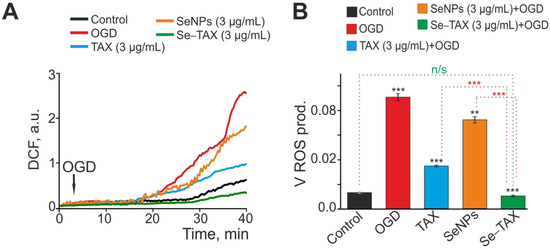 Effects of taxifolin (TAX), selenium nanoparticles (SeNPs), and selenium–taxifolin nanocomplex (Se–TAX) on OGD-induced ROS production. (A) Total ROS production during OGD (40 min) depending on a 24 h incubation of the cell cultures with 3 μg/mL TAX, 3 μg/mL SeNPs, or 3 μg/mL Se–TAX. Average curves plotted according to data from several dozen cells are represented. (B) Effect of the TAX, SeNPs, or Se–TAX on the ROS production rate. The average ROS production rates within the interval from the point of OGD onset to the end point of the experiment are represented. n/s—data not significant (p > 0.05), ** p < 0.01, and *** p < 0.001, compared with control.
