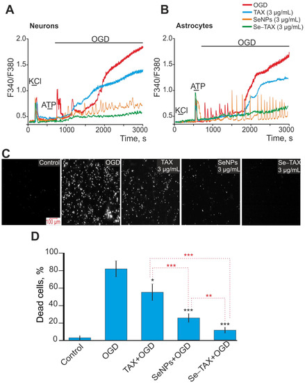 Effect of preincubation of cerebral cortex cells with TAX, SeNPs, or Se–TAX on Ca2+ signal generation and survival after OGD. (A,B) Ca2+ signals in neurons (A) and astrocytes (B) during OGD (40 min) and OGD after 24 h preincubation with 3 μg/mL taxifolin, 3 µg/mL SeNPs, or 3 µg/mL Se–TAX. Short-term applications of 35 mM of KCl and 10 µm of ATP were used to distinguish neurons and astrocytes, respectively. Ca2+ signals from neurons and astrocytes averaged over several dozens of cells are presented. The experiments were performed in three replicates on three separate cell cultures. (C) Images of cortical cell culture loaded with propidium iodide (PI). The white dots represent the PI-stained nuclei of necrotic cells. (D) Effect of 24 h incubation with TAX, SeNPs, or Se–TAX on the cell viability after 40 min OGD. Black asterisks indicate the differences between the experimental groups compared with the OGD group. Differences between experimental groups are marked with red asterisks. *** p < 0.001, ** p < 0.01, and * p < 0.05.