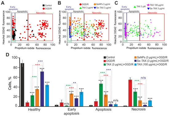 The effects of 24 h cell incubation with TAX (3 or 100 μg/mL), SeNPs (3 µg/mL), or Se–TAX (3 µg/mL) on the survival of cerebral cortical cells after 2 h OGD and 24 h reoxygenation (OGD/R). (A–C) Cytograms demonstrating the viability of cortical primary cultured cells in control (without OGD/R) and after OGD/R (A), after OGD/R with TAX (3 μg/mL), SeNPs (3 µg/mL), or Se–TAX (3 µg/mL) (B) and after OGD/R with TAX (3 or 100 μg/mL) and Se–TAX (3 µg/mL) (C). X-axis—the intensity of PI fluorescence; Y-axis—the intensity of Hoechst 33342 fluorescence. Cells were stained with the probes 24 h after the OGD/R. (D) Effect of 3 or 100 μg/mL TAX, 3 µg/mL SeNPs, or Se–TAX on the induction of necrosis and apoptosis 24 h after OGD/R. N cell cultures = 5; n cover slips with cells for each sample = 5. For panel (D), results are presented as mean ± SEM. Black asterisks indicate the differences between the experimental groups comparable to the OGD group. Differences between experimental groups are marked with asterisks of different colors. n/s—data not significant (p > 0.05), *** p < 0.001 and ** p < 0.01. Cell images are presented in Supplementary Figure S1.