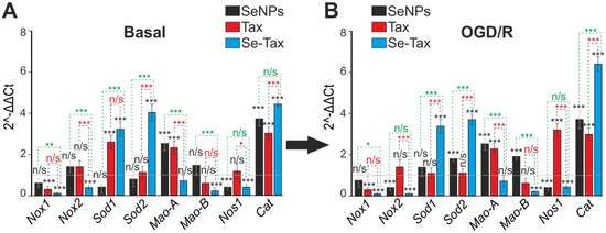 Survival of brain cells under conditions of ischemia/reoxygenation depends on the redox status of the cells. Using PCR analysis, it was found that TAX reduced the basic expression of Nox1 and increased the level of Sod1, Mao-A, and Cat (Figure 8A, TAX), indicating an increase in the antioxidant status of cells. SeNPs are less effective in regulating the antioxidant status of cells. Preincubation with 3 μg/mL SeNPs resulted in an increase in the baseline expression of Mao-A and Cat with a decrease in the level of Nos1 (Figure 8A, SeNPs). Incubation of cells with the Se–TAX nanocomplex resulted in a striking change of the basic expression of the genes that regulate the redox status. Two hours after incubation of cells with Se–TAX, the expression of most of the genes encoding ROS generating the proteins Nox1, Moa-A, Moa-B, and Nos1 was suppressed. This occurred simultaneously with an increased expression of genes encoding the ROS-consuming proteins Sod1, Sod2, and Cat (Figure 8A, Se–TAX).