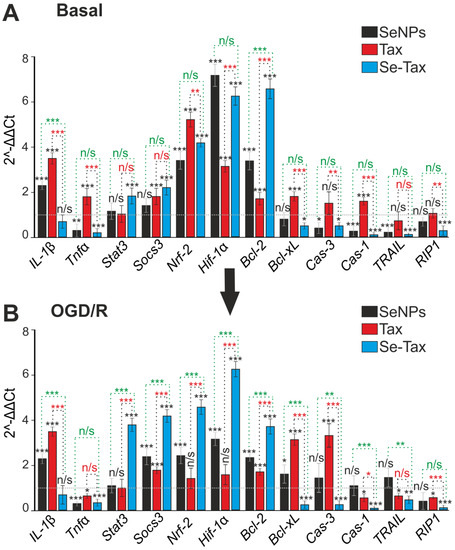The effect of 24 h incubation of mice cortical cells with 3 μg/mL taxifolin (TAX), 3 μg/mL SeNPs, or 3 μg/mL Se–TAX on the basal (A) and OGD/R-affected (B) expression of genes that regulate cell death and inflammation. Gene expression in control cells is marked with a dashed line for panel (A). Gene expression in OGD/R cells without treatment with test compounds are marked with a dashed line for panel (B). Statistical significance was assessed using t-test. Comparison of experimental groups with control: n/s—data not significant (p > 0.05), * p < 0.05, ** p < 0.01, and *** p <0.001. Comparison of experimental groups with each other is indicated in red or green. The number of RNA samples is 3.