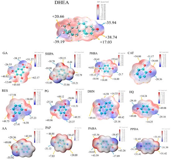 MEPs mapped onto 0.001 a.u. electron density isosurface of DHEA and twelve coformers. The electrostatic potential extreme points (kcal/mol) are represented in blue and red, and the value is marked in black.