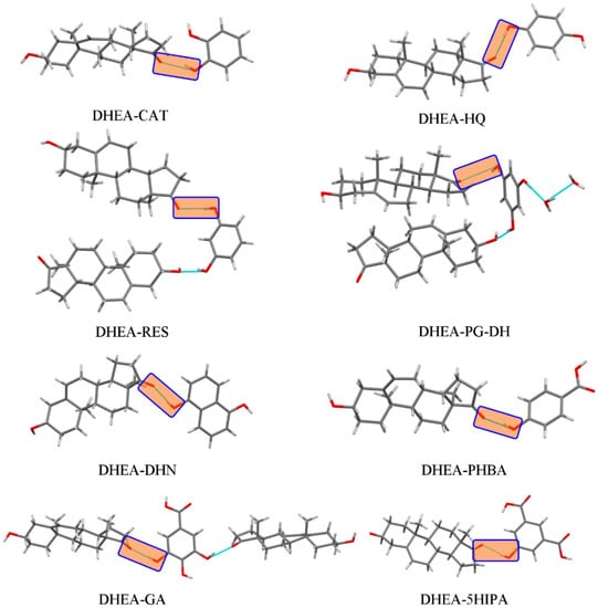 1D hydrogen-bonding interaction of (a) DHEA-CAT and (b) DHEA-DHN.