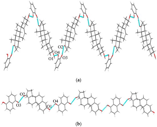 DHEA-HQ cocrystal (1:1). The ASU of DHEA-HQ contains one DHEA molecule and one HQ molecule (orthorhombic, P212121). As the way we designed (C=O···HO-Ar synthon), DHEA interacts with HQ through O2···H4-O4 (2.833 Å), forming a basic structural unit. Subsequently, DHEA-HQ unit links each other via O3-H3A···O1 (2.777 Å) interactions to form a 1D supramolecular chain, then O1-H1···O4 (2.881 Å) interaction contributes the final formation of 2D infinite chain in Figure 4a.