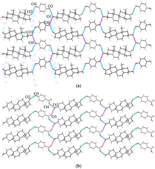 DHEA-PHBA cocrystal (1:1). The structure of DHEA-PHBA is very similar to that of DHEA-HQ. The space group is P21 with Z = 2. There is one DHEA molecule and one PHBA molecule in the ASU. Analogously, C=O···HO-Ar synthon O2···H5-O5 (2.731 Å) interaction is also observed in DHEA-PHBA. To construct the 2D framework, O4-H4·· O1 (2.584 Å) interaction (blue line) and O1-H1···O3 (2.893 Å) interaction (purple line) are regarded as the bridge of infinite 1D chain and following 2D skeleton, respectively (Figure 4b).