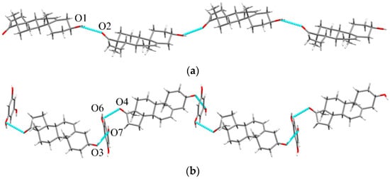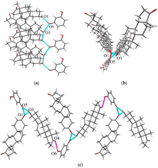 DHEA-RES cocrystal (2:1). The DHEA-RES takes the orthorhombic P212121 space group with Z = 4. The ASU of DHEA-RES contains two DHEA molecules and one RES molecule. A supramolecular three-fold helix is formed via continuous O5-H5···O1 (2.671 Å), O1-H1···O3 (2.859 Å) and O3-H3A···O5 (2.858 Å) interactions as shown in Figure 5a,b. These helixes are then connected through O4···H6A-O6 (2.798 Å) to construct the 2D hydrogen-bonding structure in Figure 5c.
