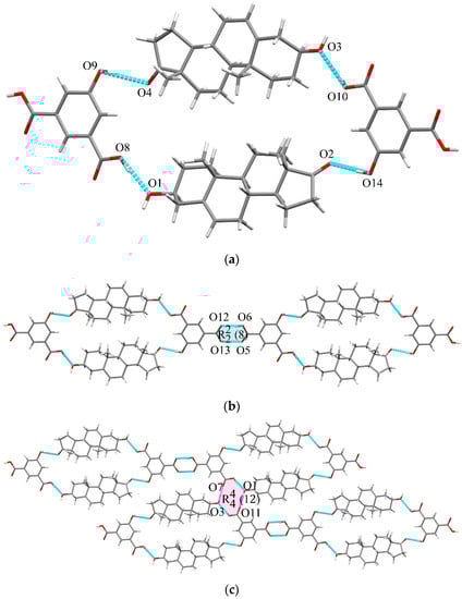 DHEA-5HIPA cocrystal (1:1). The crystal structure belongs to the triclinic P1 space group with DHEA and 5HIPA in 1:1 stoichiometry. Two DHEA and two 5HIPA molecules first connected by O8−H8A···O1 (2.597 Å), O9−H9A···O4 (2.766 Å), O10−H10···O3 (2.548 Å) and O14−H14A···O2 (2.753 Å) interactions in Figure 8a. The tetramers then interact via an (8) supramolecular homosynthon through O6−H6A···O12 (2.602 Å) and O13−H13···O5 (2.586 Å) hydrogen bonds to form 1D polymeric chains (Figure 8b). Polymeric chains are further connected through an (12) supramolecular homosynthon to form 2D layers through O1−H1···O11 (2.731 Å) interaction and O3−H3A···O7 (2.701 Å) (Figure 8c).