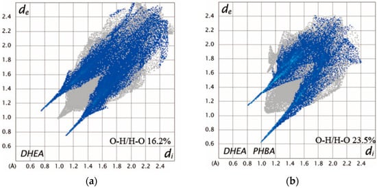 Crystal Explorer 21.5 is applied to obtain the 2D fingerprint plots of DHEA, DHEA-PHBA, and DHEA-GA as a visualization tool to encode the information qualitatively and quantitatively on intermolecular atomic close contacts. Corresponding results are presented in Figure 9. The percentage of area occupied by H-bond interactions is also marked in it. Besides, di and de are the distance from the Hirshfeld surface to the nearest nucleus inside and outside the surface, respectively. According to the literature, polar interaction (H···O) is often considered to represent hydrophilicity, while the nonpolar interactions (C···H, C···C, and C···O) to represent hydrophobicity []. As for DHEA-GA and DHEA-PHBA, it is obvious that the formation of an H-bond between DHEA and coformers and the construction of an H-bond net structure contributes a lot to the enhanced polar interactions between cocrystal molecules. Due to its largest proportion of H-bond interactions (28.2%) among crystalline DHEA, DHEA-PHBA, and DHEA-GA, DHEA-GA is supposed to possess the highest solubility and exhibit the best dissolution performance in-vitro. This concept is also proved by further experiments.