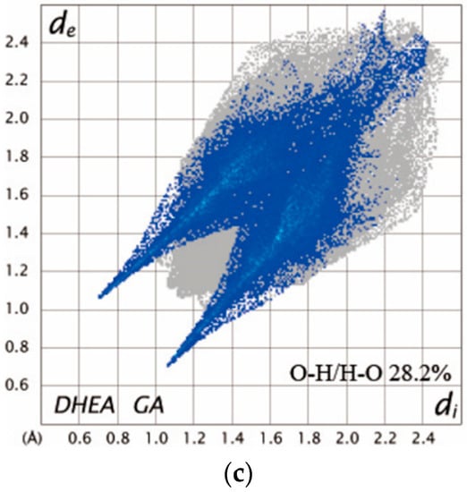 2D fingerprint plots for (a) DHEA, (b) DHEA-PHBA, and (c) DHEA-GA, showing the contribution of H···O/O···H interactions.