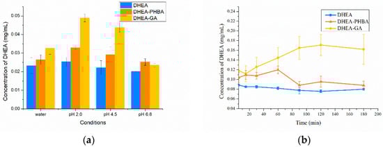 (a) Comparison of solubility of DHEA, DHEA-PHBA, and DHEA-GA under different conditions and (b) Comparison of solubility and dissolution performance of DHEA, DHEA-PHBA, and DHEA-GA under different conditions.