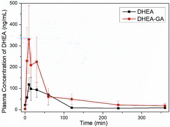 Plasma DHEA concentration versus time curves of DHEA and DHEA-GA in SD rats (male, n = 6).