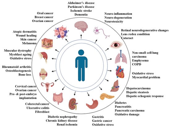 Most of the research to date is focused on α-tocopherol, which is the ubiquitous form of vitamin E and the major form of vitamin E within human cells and tissues. However, gamma-tocopherol is the major form of vitamin E in the US diet [31]. Nevertheless, comparative studies available in the literature reveal better efficacy of tocotrienols compared to that of α-tocopherol in the management of several diseased conditions [32,33,34,35,36]. It has been postulated that the better antioxidant and related efficacy of tocotrienols might be due to the presence of unsaturated side chains in tocotrienol [32]. Overall, these tocotrienol forms of vitamin E, when supplemented, have been shown to attenuate a wide spectrum of diseases, which has been summarized in Figure 1 and Table 1.