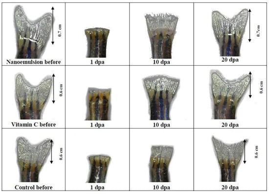 This section will emphasize recent research reported in the literature to investigate the wound-healing potential of tocotrienols. The antioxidant potential of tocotrienols is 60 times more potent than tocopherols [17]. It is well known for alleviating oxidative stress and inflammation in complications associated with diabetes. In the case of diabetic wounds, prolonged healing time and impairment in the healing process are the main setbacks in treatment. The main goal is a rapid closure of the diabetic wound; therefore, several strategies were explored for better treatment. With this aim, Yeo et al. explored the potential of tocotrienols-rich naringenin nanoemulgel for diabetic wound treatment. The optimized formulation showed uniformed dispersed globules (145.58 nm) with a narrow polydispersity index and negative zeta potential (−21.1 ± 3.32 mV). Moreover, nanoemulgel has good spreadability with a viscosity of 297,600 cP. A sustained release profile was observed with approx. 74% release of tocotrienols-rich naringenin from nanoemulgel. However, nanoemulsion showed higher release (89.17 ± 2.87%), which may attribute to the absence of polymer coating on disperse phase [107]. However, further studies are required to investigate the potential of nanoemulgel for diabetic wounds. Similarly, Chong et al. investigated the effectiveness of tocotrienol-based nanoemulsion on wound healing through zebrafish tail regeneration experiment and scratch assay. The MTT (3-[4,5-dimethylthiazol-2-yl]-2,5 diphenyl tetrazolium bromide) assay showed more than 100% cell viability when cells were treated with nanoemulsion (0.35–8.75 μg/mL) with a significantly faster rate of wound closure than in control groups. As shown in Figure 4, zebrafish tail growth was more rapid in the nanoemulsion (2.5 mg/mL) treated group than in the control group [17]. The 40%, 60%, and fully recovered regeneration was observed on the fifth day, the tenth day, and the twentieth day of nanoemulsion treatment, respectively. It concludes the potential of tocotrienol emulsified formulation for accelerated wound closure [17].