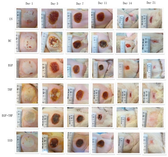 Wound closure of deep partial-thickness burn wounds over time in Sprague Dawley rats. (UN, without any treatment; BC, treated with base cream; Epidermal growth factor (EGF), treated with base cream containing c% EGF; Tocotrienol-rich fraction (TRF), treated with base cream containing 3% TRF; EGF + TRF, treated with base cream containing both c% EGF and 3% TRF; and SSD, treated with SSD cream) (adapted from [93], published by MDPI, 2020).