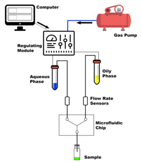 Despite the advantages, several related problems have made their development still challenging. Among them, the classical synthesis of LPs is unreliable; thus, it has become essential to find innovative emerging methods that enable safe, fast, and high-level batch-to-batch reliability production. To prevail over these challenges, applications of microfluidic (MF) technique to the development of new formulations in NM have successfully been exploited [14,15,16]. MFs have emerged in recent years as a suitable tool for biosensing and DDSs’ production, since MF removes some of the critical issues that prevent NM from becoming a concrete reality [17]. The in-flow technique is scalable and allows for a drastic reduction in production time, greatly improving the quality of the finished product [2]. As MF ensures strict control over all operational parameters, the result can be optimized with experimental trials, and once optimal conditions are identified, batch-to-batch variability is eliminated [18,19]. Furthermore, in comparison to conventional methods, MF-based processes ensure less consumption of solvents that currently constitute the 80–90% of all materials used during pharmaceutical production. This technique can minimize the environmental impact, leading the way to a more sustainable approach [20].