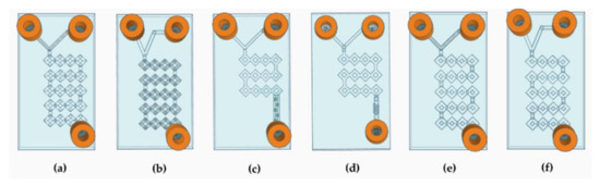Schematic representation of the devices’ CAD design. (a) Representation of device 1. (b) Representation of device 2. (c) Representation of device 3. (d) Representation of device 4. (e) Representation of device 5. (f) Representation of device 6.