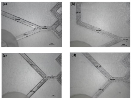 Optical microscope images of DLP 3DP devices (8×). (a) Inlet’s image of device 2. (b) Inlet’s image of device 6. (c) Inlet’s image of device 1. (d) Inlet’s image of device 5.