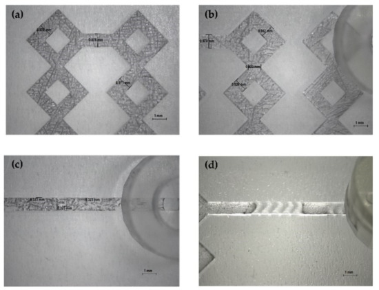 Optical microscope images of DLP 3DP devices (8×). (a,b) Image of the microchannels of devices. (c) Image of wedges (device 3). (d) Image of the modified herringbone structure (device 4).
