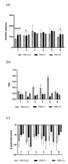 Representative graphs of empty LPs produced using DPPC/16:0 PEG2000 PE/Chol (2:2:1) in ethanol at total concentration 1mg mL−1. (a) Comparison of particle size (nm) of obtained LPs using different devices at several FRRs. To compare size, one-way ANOVA analysis was performed, adhering to a p value ≤ 0.05. In accordance with the results, comparing all devices for each FRRs, it was found that there was a significant difference (reported on the graph). Comparing each device for all FRRs, it was found that there was a significant statistical difference (****, p value < 0.0001) for device 1, while for device 2 and device 6 the statistical difference was modest (*, p value < 0.0332). (b) Comparison of PDI of obtained LPs using different devices at several FRRs. (c) Comparison of Z-potential (mV) of obtained LPs using different devices at several FRRs. Results represent mean ± SD, n = 3 independent batches.