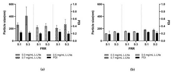 Resulting data in the production of L-LPs using several concentrations of lysozyme (0.3, 0.5, and 0.7 mg mL−1) at both FRR 5:1 and 5:3. (a) Achieved data using device 1. (b) Achieved data using device 4. Results represent mean ± SD, n = 3 independent batches.