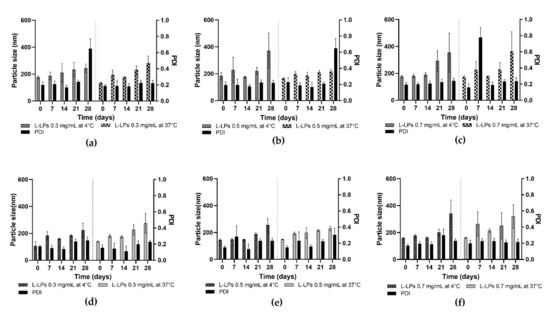 At 4 °C, an increase in the size of the L-LPs produced with device 1 is noted (Figure 8a–c), which starts early and maintains an almost constant trend until day 28. Concerning L-LPs produced with device 4, on the other hand, less of a growth trend is shown, which becomes more pronounced in the last week of analysis (Figure 8d–f). Stability at 37 °C was assessed for the formulations produced with both devices to analyse any changes that may affect phospholipids at higher temperatures (Figure 8). Although the growth trend of the LPs is more pronounced than at storage temperature, the L-LPs maintain a size available to drug administration [46]. Although physical stability tests were successful for both device formulations, device 4 proved to be the better performer in terms of produced L-LPs.