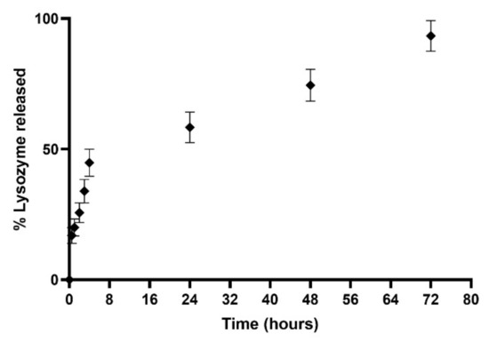 The release study was conducted under dynamic dialysis for three days at 37 °C in PBS (pH 7.4). Resulting data are displayed in Figure 10. The obtained release profile exhibited that the L-LPs 0.5 mg mL−1 formulation allowed for 93.36 ± 5.85% release of the total payload until 72 h of incubation. The profile showed an initial rapid release up to 44.82 ± 5.16% in the first 4 h of incubation, and then, the curve turned into a zero-order kinetics release (R2 = 0.9985) [57], which performed a controlled release over time. This kind of combined-kinetics release could be explained taking into account the placement of drugs within LPs, considering the fast release of lysozyme placed next to the lipid bilayer instead of the slow and constant path of drug located within the LPs aqueous core [58]. In comparison with a previous study [32], there was a slightly higher release explained by considering the lower molecular weight of the considered drug (≅14 kDa) [59]. In particular, for LPs, it is crucial to consider the type of aliphatic chain constituting the phospholipids and the transition temperature associated with them; thus, it may influence the release profile at physiological temperatures [60]. In addition, a major aliphatic chain was shown to result in the formation of additional hydrophobic and Van der Waals interactions that stabilize the structure and protect the drug from faster release over time [61].