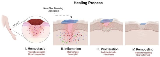 There are several advantages to using nanofibers to make drug-releasing wound dressings, mainly because these materials can protect the wound, absorb exudates, provide better penetration of the drug into the wound bed, increase intracellular uptake, reduce toxicity, reduce the frequency of topical application and increase patient compliance, and accelerate the healing process [116,117,118]. In addition to drug delivery, nanofibers can be a promising tool for the incorporation of macromolecules, antibiotics, anti-inflammatory, growth factors, enzymes, or nucleic acids due to their specific delivery capacity allowing high bioactivity due to controlled release [119,120].