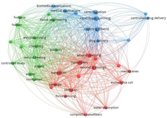 From a bibliographic analysis carried out using the Scopus database (31 August 2022), searching the keywords “rotary jet spinning” or “centrifugal spinning” or “rotor spinning” or “pressure gyration”, which are common names for the RJS technique, 2651 documents were found. After this first screening, the keyword “wound dressing” was added, which is the focus of this review, and 25 occurrences were found between 2012 and 2022. Once the search was carried out in Scopus, the Vosviewer (version 1.6.18) software was used to build up the bibliometric map [64]. This software helps to visualize the bibliometric landscape of this theme, grouping the keywords related to the RJS technique into three clusters (Figure 2). The red group has the majority of the keywords (wound dressing, nanofibers, membranes, biocompatibility, bandage, and chitosan), followed by the green cluster (humans, tissue regeneration, electrospinning, and wound healing) and the blue cluster (centrifugal spinning, centrifugal, spinning (fibers), biomedical applications, and drug delivery). From Figure 2, we confirm the great demand for the nanofibers produced via the RJS technique, also showing its notorious research in the biomedical field, and wound dressing fabrication.