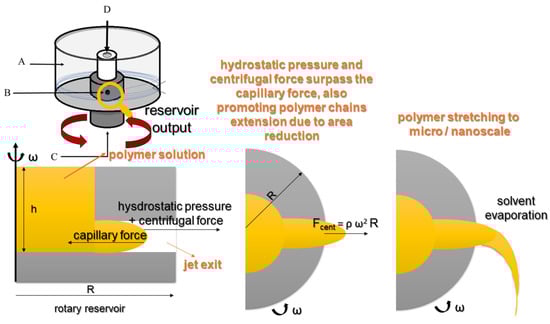 Polymer molten jet formation in the RJS apparatus (modified with permission from [74], Copyright 2018, IOP Publishing Ltd.).