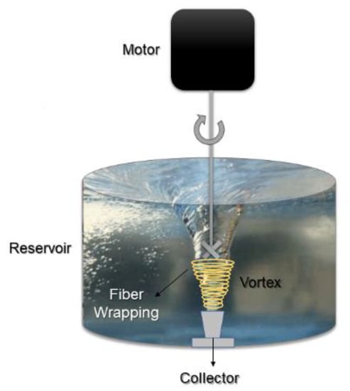 RJS technology is a prospective method to manufacture high-performance three-dimensional nanofibers with uniform morphology, high efficiency, and productivity. In this process, there are key parameters that control the fiber properties (diameter, mechanical strength, morphology, porosity, etc.), including polymer concentration, rotational speed, nozzle diameter, orifice-to-collector distance, and solvent volatility [23,40,71,80,81,82].
