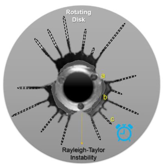 Nozzle-less RJS does not use a needle for the polymer extrusion; instead, it pulls out of a lid-disk gap in the center of a rotating disk collector, thus the jet liquid polymer produces “fingers” due to Rayleigh–Taylor instability (Figure 7). Such a method is an alternative to nozzle RJS systems that are susceptible to high viscous polymer clogging of the needle orifice [37].