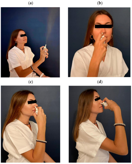 (a–d) Modality of spraying Tonimer Lab Panthexyl 800 inside the nasal cavity. The patient’s head must be kept in an upright position the intranasal nozzle device is first inserted vertically inside the nostril to penetrate 5 mm into the airspace and subsequently inclined upon the horizontal plane.
