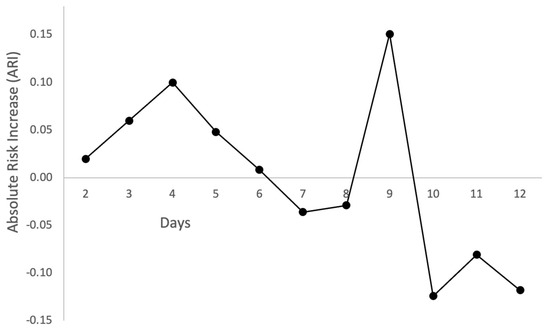 Distribution of absolute risk increase (ARI) over time (days between initial positive and first negative SARS-CoV-2 swab test result).