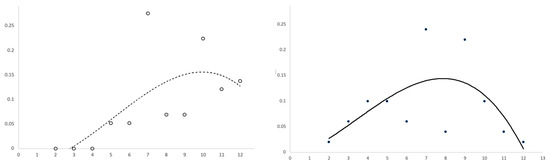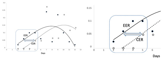Figure 3 shows two scatter plots reporting days on the horizontal axis and CER (left plot) or EER (right plot) on the vertical axis. Since data contained many fluctuations, a curved trend line was fitted using a third degree polynomial function. CER and EER points were reasonably close to the trend line in the first (left) part of each graph, while from day 6 onward the points became over-dispersed.