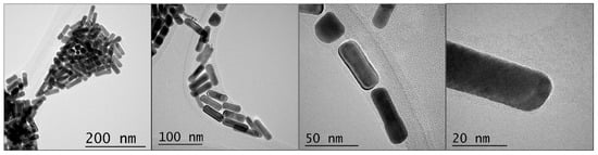 The CTAB-AuNRs dispersion was washed 2 times with 2 mL of ultrapure water and recovered by centrifugation. Subsequently, the pellet was dispersed in 2 mL of ultrapure water and a few microliters of AuNRs were deposited onto lacey carbon grids and left to dry in the air before the examination. The observation was performed by transmission electron microscopy (TEM) analysis using the bright field in a conventional parallel beam (CTEM) mode (BF). An ATEMJEOL JEM-2010 (JEOL Ltd., Musashino, Akishima, Tokyo, Japan) equipped with a 30 mm2 window energy-dispersive X-rays spectrometer was used.