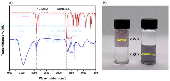 The optical properties of AuNRs and AuNRs-C12 in DMSO were evaluated by a double beam spectrophotometer (Shimadzu UV-2401PC) in the range of 350–900 nm. AuNRs-C12 and 12-MDA were analyzed by FT-IR spectroscopy (Bruker Alpha II spectrometer) in KBr pellets. In particular, to obtain a solid sample of AuNRs-C12, the organic dispersion was dialyzed (MWCO 12–14 kDa) for two days against ultrapure water and then freeze-dried. The FT-IR spectra were recorded in the range of 400–4000 cm−1 (scan times: 24; resolution: 4 cm−1).