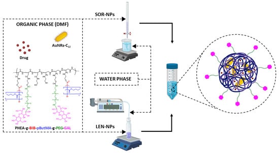 A suitable amount of AuNRs-C12 dispersion corresponding to 2 mg of Au was recovered by centrifugation (10,000 rpm, 10 min, 25 °C); after centrifugation, the supernatant was discarded and the pellet was retrieved with 1 mL of DMF. Subsequently, 500 µL of PHEA-g-BIB-pButMA-g-PEG-GAL solution in DMF (20 mg mL−1) and 500 µL of sorafenib tosylate solution in DMF (4.57 mg mL−1) were added in sequence.