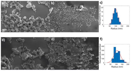 The SOR-NPs SEM images (Figure 6a,b) revealed the presence of almost spherical nanoparticles with an average radius around 98 ± 18 nm (diameter around 200 nm) with a classical Gaussian distribution (Figure 6c), confirming the dimensions obtained by DLS analysis. In addition, LEN-NPs SEM acquisitions (Figure 6d,e) showed the presence of nanoparticles of a not very regular shape with an average radius around 107 ± 28 nm (diameter around 200 nm) and with a wider Gaussian distribution (Figure 6f) if compared to SOR-NPs, as already indicated by the PDI value of the DLS analysis.