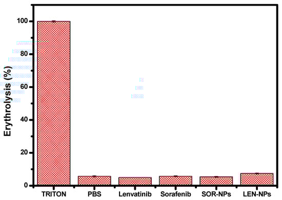 Erythrocompatibility studies. Erythrolysis percentages of SOR-NPs, LEN-NPs, equivalent amounts of free drugs, and PBS only, compared with Triton X-100 as a positive control.