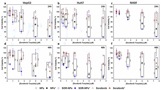 Similar data were also found for the HuH7 cell line, except for the free drug efficacy that resulted in being slightly lower for both the analyzed times (Figure 9b,e), with a 40% cell viability reduction at the higher concentration after 48h. The same result was obtained for non-irradiated SOR-NPs after 48 h.
