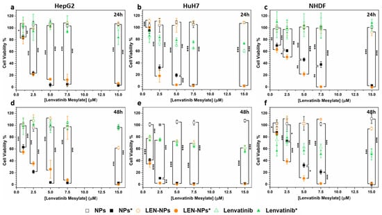 Successively, the medium was replaced with a dispersion of SOR-NPs (sorafenib tosylate concentration ranging from 7.5 to 0.5 μM) or LEN-NPs (lenvatinib mesylate concentration ranging from 15 to 1 μM) and incubated for 24 or 48 h.