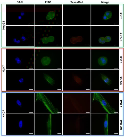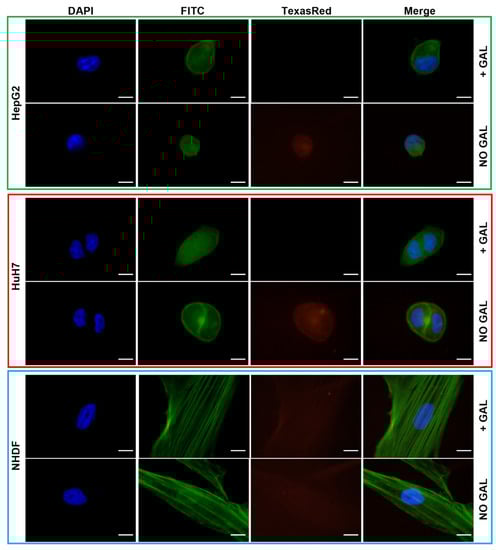 To this end, empty NPs (containing AuNRs-C12) labelled with rhodamine B were added on both HCC and human fibroblast cell lines and analyzed after 4 and 24 h of incubation. In order to understand if the uptake was affected by the presence of the galactose target, we also performed this study pre-incubating free galactose on the cells, before adding labelled NPs, aiming the saturation of the asialoglycoprotein receptor.