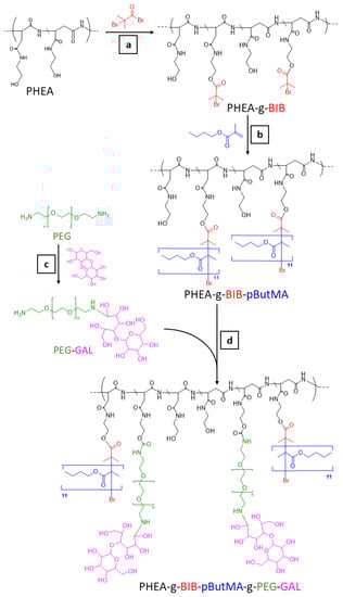 To confer amphiphilicity and to allow for a nanoparticle formation, PHEA was first functionalized with α-bromoisobutyryl bromide (BIBB), obtaining a “macroinitiator” for the polymerization via atom transfer radical polymerization (ATRP), and butyl methacrylate (ButMA) hydrophobic monomers were thus polymerized, in order to make the final derivative, PHEA-g-BIB-pButMA, suitable for the preparation of nanoparticles []. Subsequently, in order to obtain a nanosystem that can be preferentially internalized by hepatocytes, the copolymer was further functionalized with galactose (GAL) residues, using poly(ethylene) glycol (PEG) as a spacer in order to confer a greater galactose exposure on the surface of nanosystems with stealth properties.