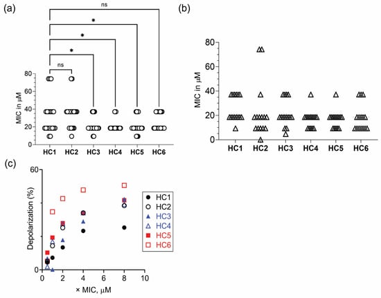 We next determined the MIC of HC peptides against a panel of Gram-negative (P. aeruginosa) and Gram-positive (S. aureus/MRSA) bacteria [38] (Table S1). Mean (± SEM) values in the range of 20 to 35 µM were obtained for HC peptides against various P. aeruginosa strains (Figure 1a). One-way ANOVA by Dunnett’s multiple comparison test indicated that the mean MIC values of HC3, HC4 and HC5 were statistically significant compared to the HC1 peptide. Against S. aureus/MRSA strains, the mean (± SEM) values were in the range of 16 to 25 µM for HC peptides. No significant difference, however, was observed in the antimicrobial properties of peptides against S. aureus/MRSA strains (Figure 1b).