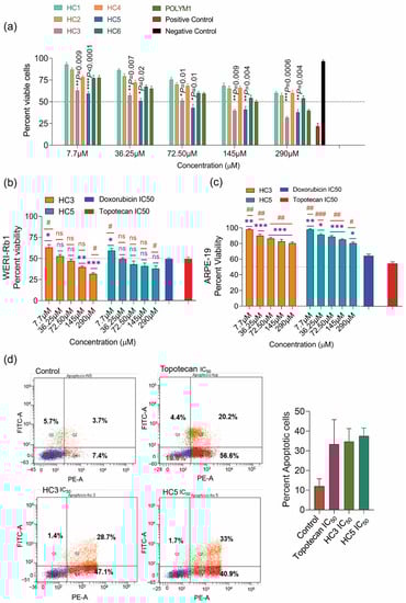 CAPs display potent anticancer activities on Rb cells. (a) Trypan blue cell count assay showing a reduction in WERI-Rb1 cell viability upon treatment with a different class of CAPs for 48 h. Untreated cells represent negative control, and Nocodazole (10 µM) treatment represents positive control. (b) MTS-based cell proliferation assay showing the response of HC3, and HC5 in WERI-Rb1 cells treated for 48 h. Doxorubicin and topotecan were used as positive controls. (c) MTS-based cell proliferation assay showing CAPs’ response in ARPE-19 cells treated for 48 h. Doxorubicin and topotecan were used as positive controls. (d) Annexin V/PI assay showing the percentage of apoptotic cells in CAPs treated cells. Values represent the mean ± s.d of three independent experiments. Two-way ANOVA with Tukey’s multiple comparisons test (for >2 groups) was used for statistical analysis. * p < 0.05, ** p < 0.01, *** p < 0.001, **** p < 0.0001, # p < 0.05, ## p < 0.01, ### p < 0.001, ns = non-significant.