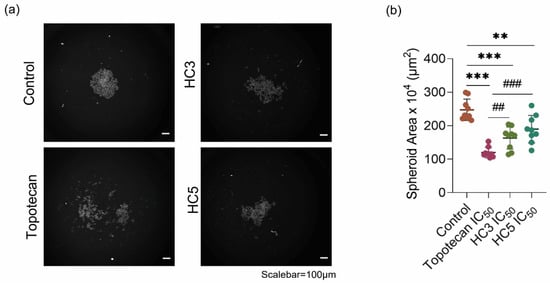 Spheroids were developed using the hanging drop protocol [29] on low attachment U-bottom 96-well plate. The single cell suspension of 5 × 102 WERI-Rb1 cells in 100 µL medium was loaded in each well of a 96-well plate. The cells were cultured at 37 °C in a 90% humidified incubator with 5% CO2 for 7 days for the generation of tight and regular tumor spheroids. Seven-day-old spheroids (n = 9 per condition) were treated with 100 μL of freshly prepared medium containing an IC50 dose of topotecan (Figure S1), HC3, or HC5. The cultures were then incubated for 48 h prior to high content analysis (HCA) and immunofluorescence (IF) assays.