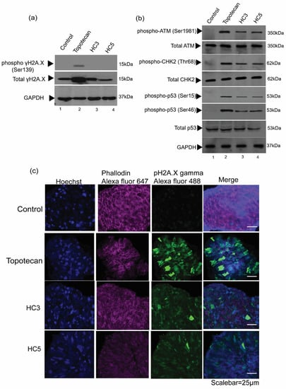 WERI-Rb1 spheroids were treated with an IC50 dose of topotecan, HC3, or HC5 for 48 h. After the treatment time point, the spheroids were carefully rinsed with ice-cold PBS and fixed with 4% paraformaldehyde for 10 min at RT. The spheroids were permeabilized with 0.1% Triton X-100 for 10 min at RT. To assess DNA damage, spheroids were incubated with the p-γH2A.X(Ser139) antibody (1:200, cat#2577, Cell Signaling Technology, Danvers, MA, USA) diluted in 5% BSA/PBS for 1 h at RT. Spheroids were carefully washed twice with 0.02% Tween 20 and 1% BSA in PBS, followed by incubation with Alexa Fluor 488 conjugated anti-rabbit (1:500, cat#A-11008, Invitrogen, Waltham, MA, USA) and Alexa Fluor Phalloidin 647 which stains for F-actin, conjugated with anti-mouse (1:500, cat#A22287, Invitrogen, Waltham, MA, USA) for 45 min at RT. After three washes with 0.02% Tween 20 and 1% BSA in PBS, the spheroid nuclei were stained with Hoechst 33342 for 5 min at RT (1:5000, cat#H1399, Invitrogen, Waltham, MA, USA). The spheroid images were visualized and captured using an upright fluorescent microscope.