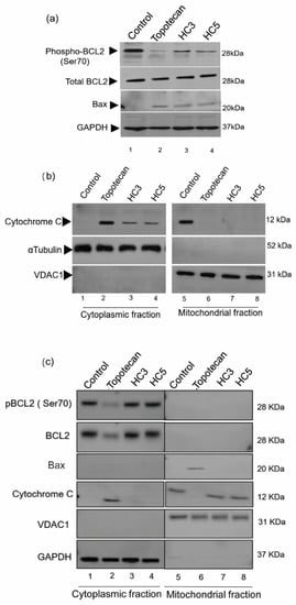 WERI-Rb1 cells were seeded in 6-well cell culture plates (1 × 106 cells/well) incubated at 37 °C in a humidified 5% CO2 incubator and were treated with the IC50 dose of topotecan, HC3, or HC5 for 48 h. After the treatment time point, the cell pellets were washed twice with ice-cold PBS and the pellets were lysed with cytoplasmic extraction buffer followed by mitochondrial extraction buffer using the cytochrome c releasing apoptosis assay kit (cat#ab65311, Abcam, Cambridge, UK) as per the manufacturer’s protocol. 20 µg of mitochondrial and cytosol protein fractions were separated on 12% SDS PAGE and were transferred to a PVDF membrane. Both mitochondrial and cytosol fractions were probed for cytochrome c, using an antibody against cytochrome c (1:1000, Abcam) provided with the assay kit. Anti-VDAC1 (1:1000, cat#ab15895, Abcam, Cambridge, UK) was used as a mitochondrial fraction loading control and GAPDH (1:2000, cat#ab9485, Abcam, Cambridge, UK) was used as cytosol fraction loading control for the assay.