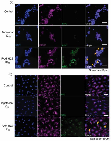 CAPs localize to mitochondria in WERI-Rb1 cells and initiate programmed cell death. (a) WERI-Rb1 cells, and (b) ARPE-19 cells were treated with topotecan IC50 and FAM-HC3 IC50 for 48 h. FAM-HC3 signal was captured at 488 nm (green). VDAC1 was used as a mitochondrial outer membrane marker and the signal was captured at 570 nm (red). The nucleus was stained with Hoechst 33322 (blue). Yellow arrows show the co-localization of FAM-HC3 with VDAC1. The scale bar is 50 µm.